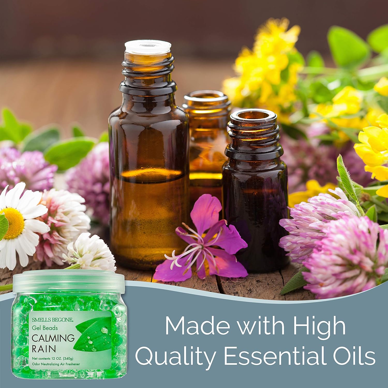 SMELLS BEGONE Odor Eliminator Gel Beads - Air Freshener - Eliminates Odor in Bathrooms, Cars, Boats, RVs and Pet Areas - Made with Essential Oils - Calming Rain Scent - 12 Ounce