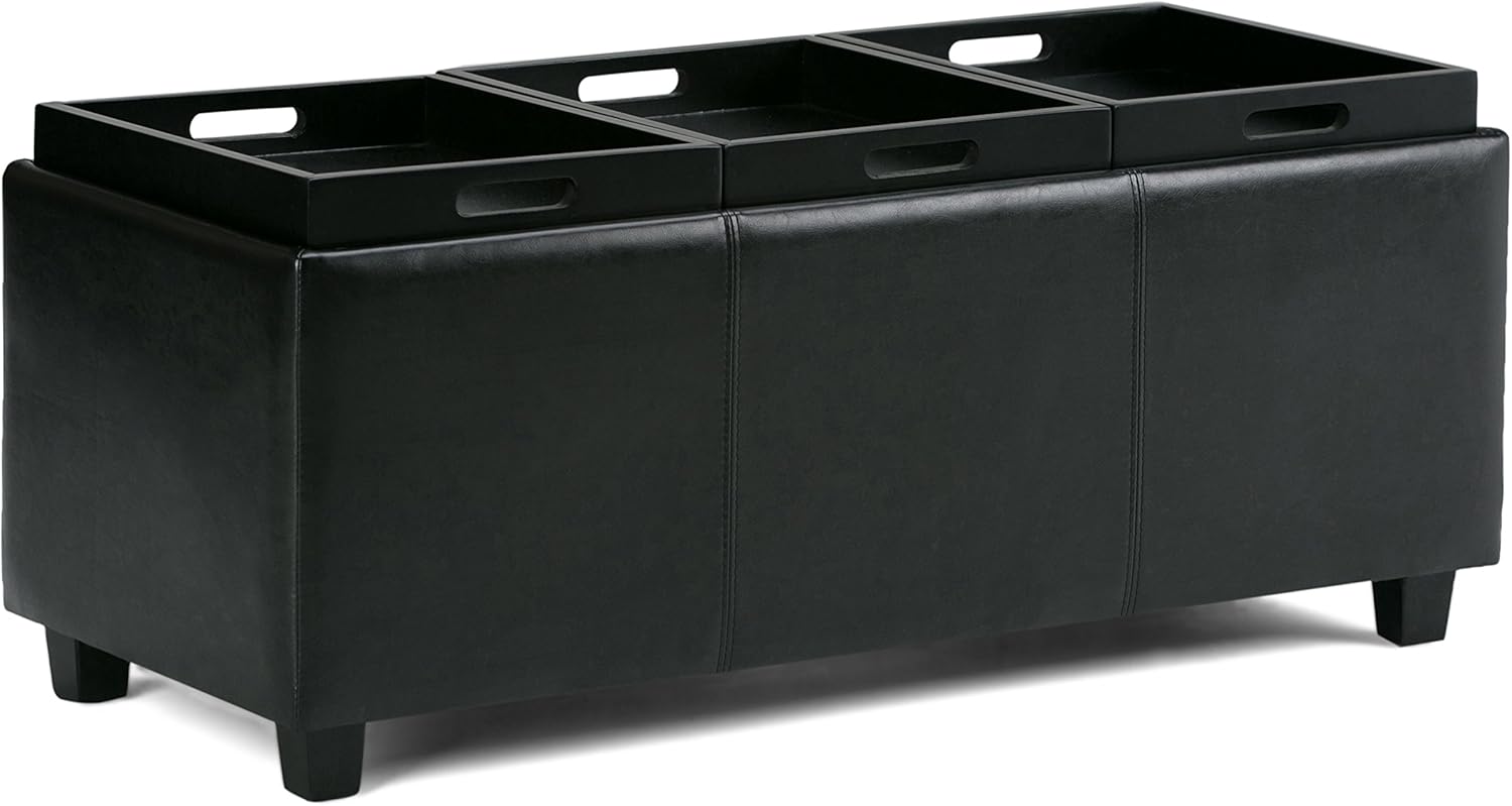 SIMPLIHOME Avalon 42 inch Wide Contemporary Rectangle Storage Ottoman in Midnight Black Vegan Faux Leather, Assembled, For the Living Room, Entryway and Family Room