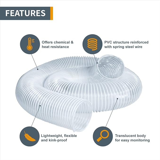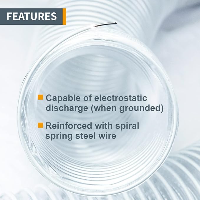 - Includes (one) 4" diameter 20 feet long left spiral clear flexible hose