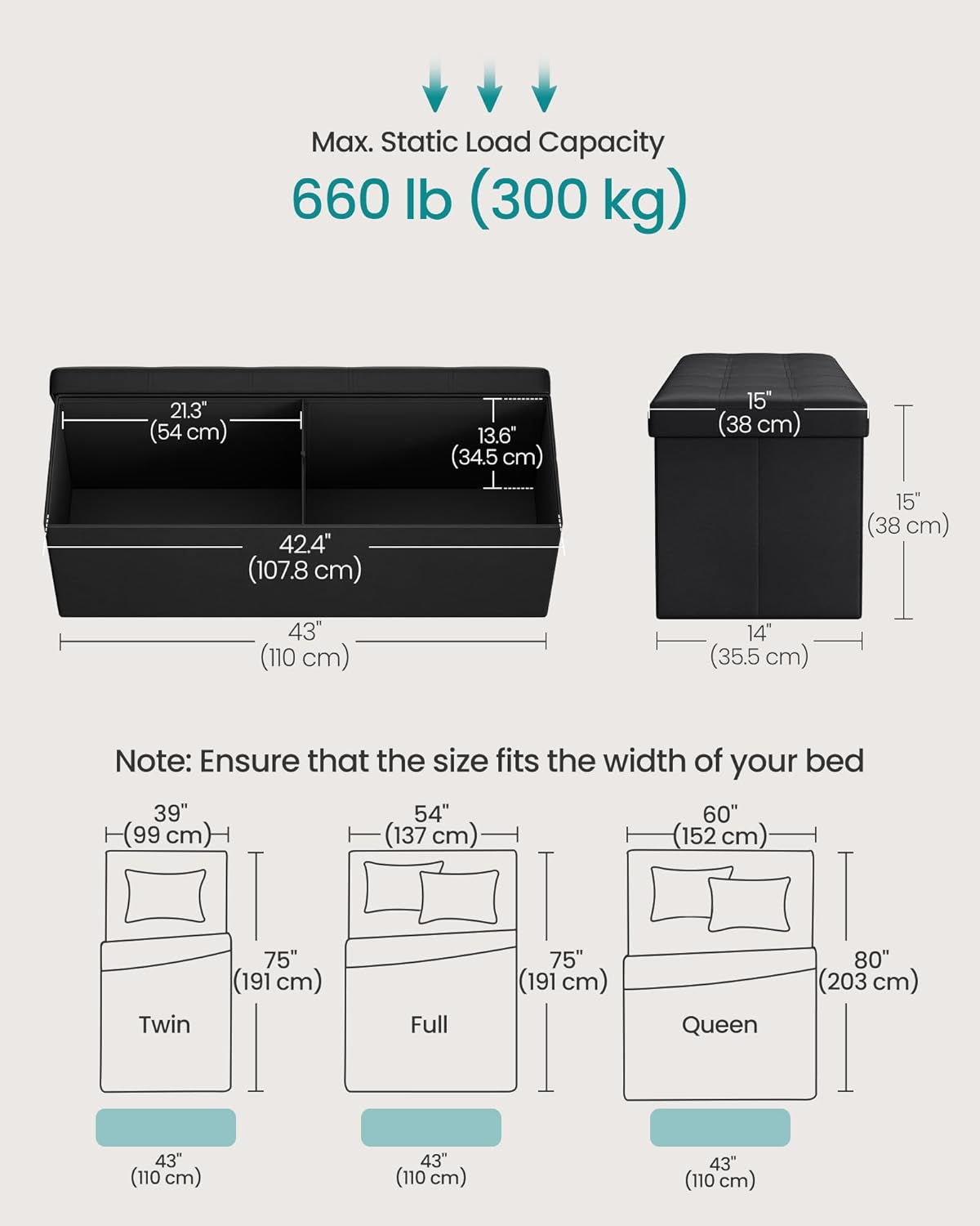 SONGMICS MAZIE Collection - 43 Inches Folding Storage Ottoman Bench, Ottoman with Storage, Foot Rest Stool, Load 660 lb, for Living Room, Synthetic Leather, Black ULSF701