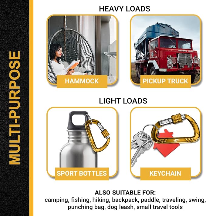 - 【Multi Purpose】 Rhino locking Carabineers are suitable for: hammock, camping, fishing, hiking, backpack, paddle, traveling, swing, punching bag, dog leash, attach sports bottles, yeti sling, keychain, travel tools, fix heavy object on a pickup truck, backpack clips for kids, keychain for women, bag hook, snap hooks, key clip for men, accessory & keychain carabiners, gear ties, toy grappling hook, cable machine accessories, key holder, d ring, boxing bag. Not For Climbing.