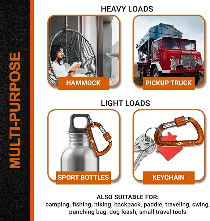 - 【Multi Purpose】 Rhino locking Carabineers are suitable for: hammock, camping, fishing, hiking, backpack, paddle, traveling, swing, punching bag, dog leash, attach sports bottles, yeti sling, keychain, travel tools, fix heavy object on a pickup truck, backpack clips for kids, keychain for women, bag hook, snap hooks, key clip for men, accessory & keychain carabiners, gear ties, toy grappling hook, cable machine accessories, key holder, d ring, boxing bag. Not For Climbing.