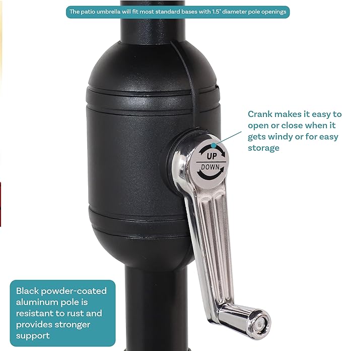 - PROVIDES OPTIMAL SHADE: This outdoor table umbrella measures 9' in diameter x 8' H overall and has a 1.5" diameter pole. It provides ample shade for 42-54" tables to keep outdoor spaces cool and comfortable. The crank is 45" H from the ground.