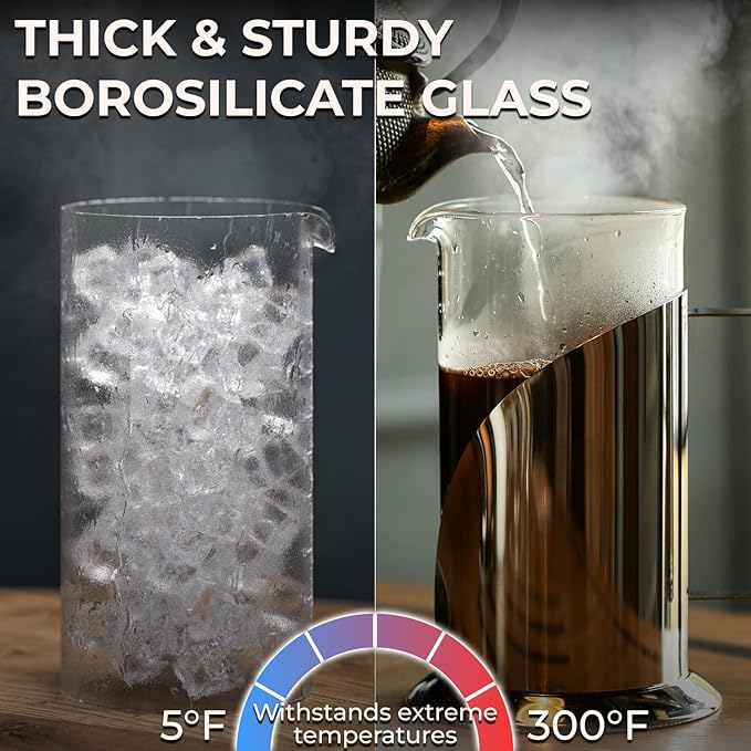 - Durable and Stylish Design: Constructed with borosilicate glass and stainless steel, this French press features a robust handle for durability and a sleek look, making it a stylish addition to your kitchen