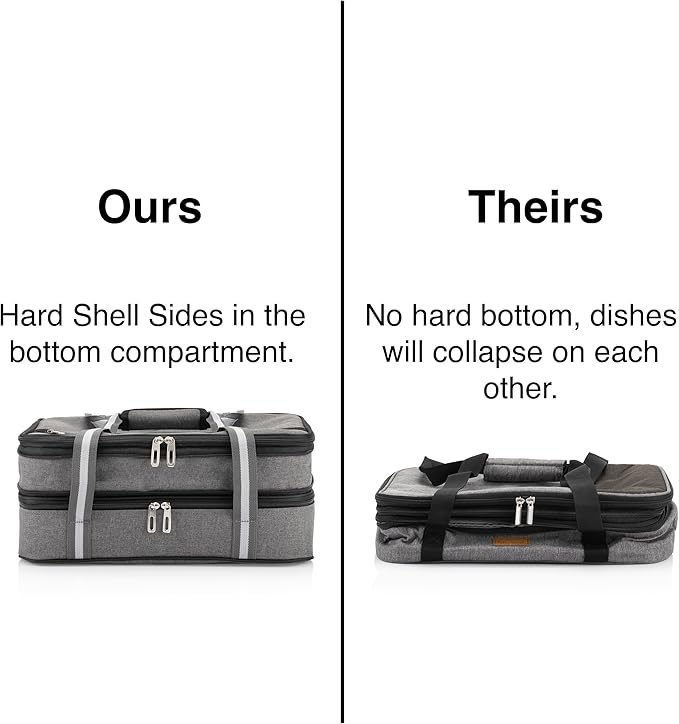 - EXPANDABLE OVERSIZED BAG: This insulated bag has a large main compartment on the bottom and an expandable top compartment. Each inside compartment is 16" x 11" x 3" and can hold a 11” x 15” baking dish (5 QT Pyrex standard glass bakeware). Dish is not included.