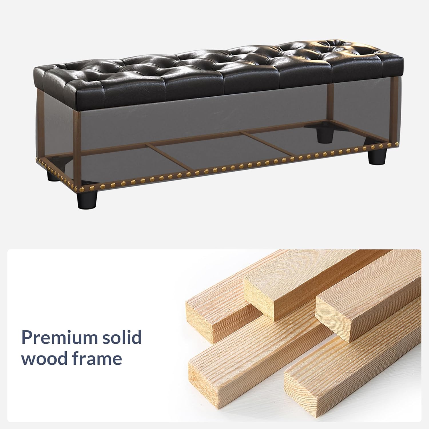 - [UNIQUE LIVING ROOM OTTOMAN] Clean-lined rectangular ottoman with a sleek frame boasts a dapper design that blends classic modern design with a luxurious appeal. Covered with faux leather upholstery with tufted button detailing at the top for an upscale look. A row of gleaming nail head trims at the bottom adds glam accents. Safety hinges ensure the lid remains open until you put away all items, preventing slamming.