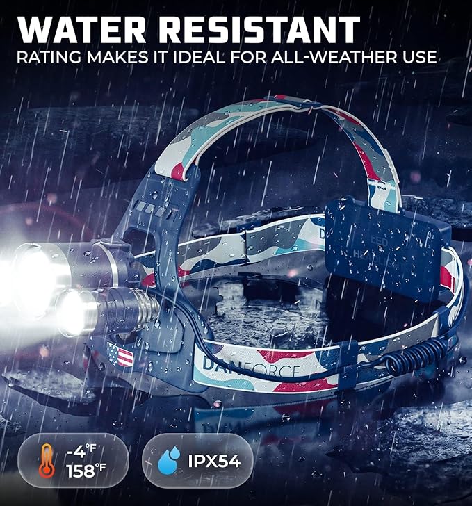 - ALL-WEATHER READY โ DanForce head lamps are built to withstand all work and weather conditions, from extreme heat to bone-chilling cold. Plus, the air-tight rubber sealing protects the LED headlamp rechargeable battery from dust, ice, and water, for ultimate dependability.