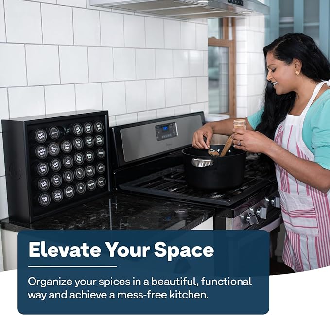- Solid Bamboo Wood - Crafted with a durable bamboo frame and painted with a sleek matte black finish, the All Spice organizer infuses style to any kitchen or pantry dรฉcor while eliminating cluttered countertops, cabinets and seasoning containers