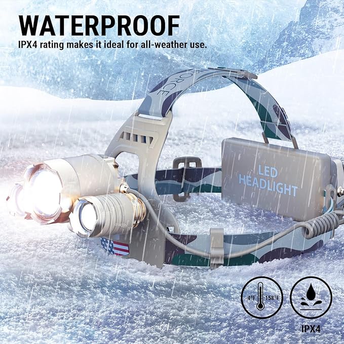 - ALL-WEATHER READY β DanForce head lamps are built to withstand all work and weather conditions, from extreme heat to bone-chilling cold. Plus, the air-tight rubber sealing protects the LED headlamp rechargeable battery from dust, ice, and water, for ultimate dependability.