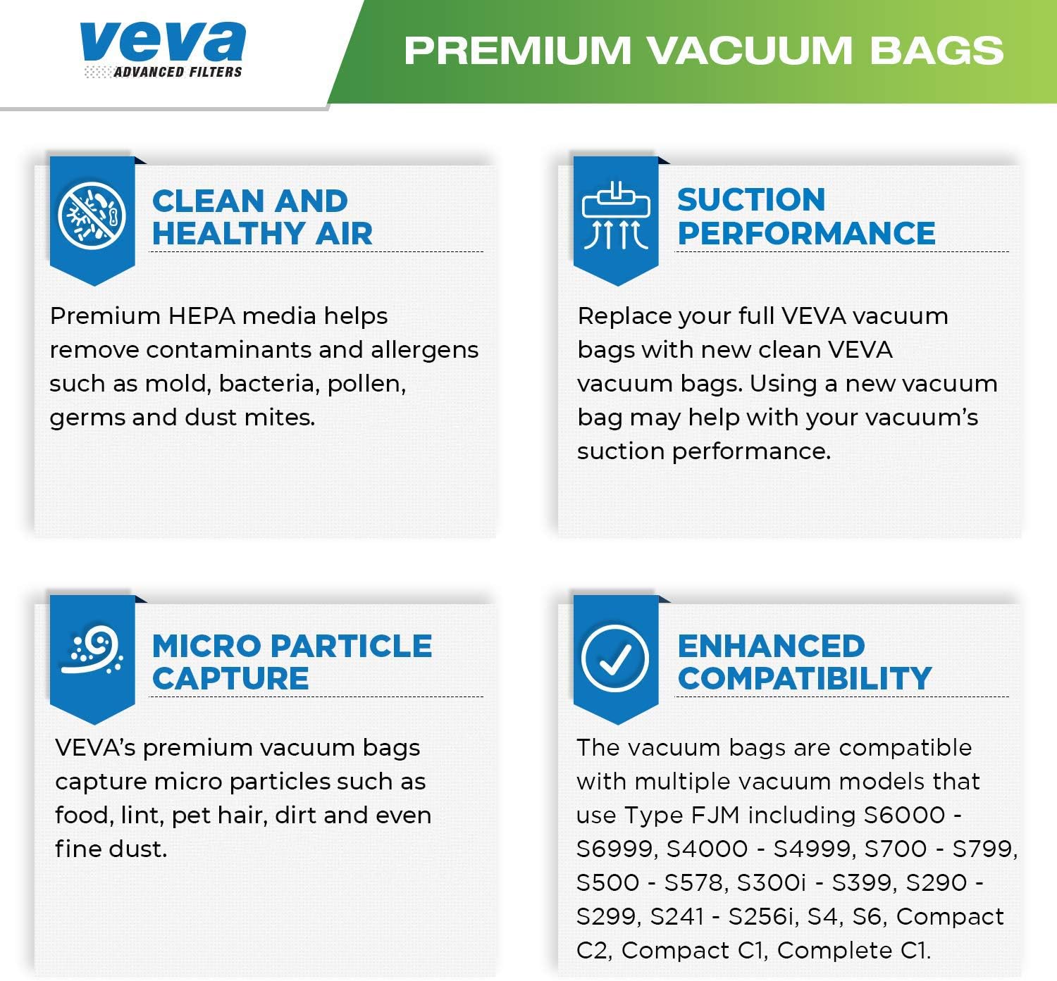 - COMPLETE REPLACEMENTS – VEVA’s premium filter bags have a collar system that prevents dust from escaping during bag disposal. An adhesive closure covers the intake hole for a no mess cleanup. VEVA bags help capture allergens to help you live in a clean and healthy home.
