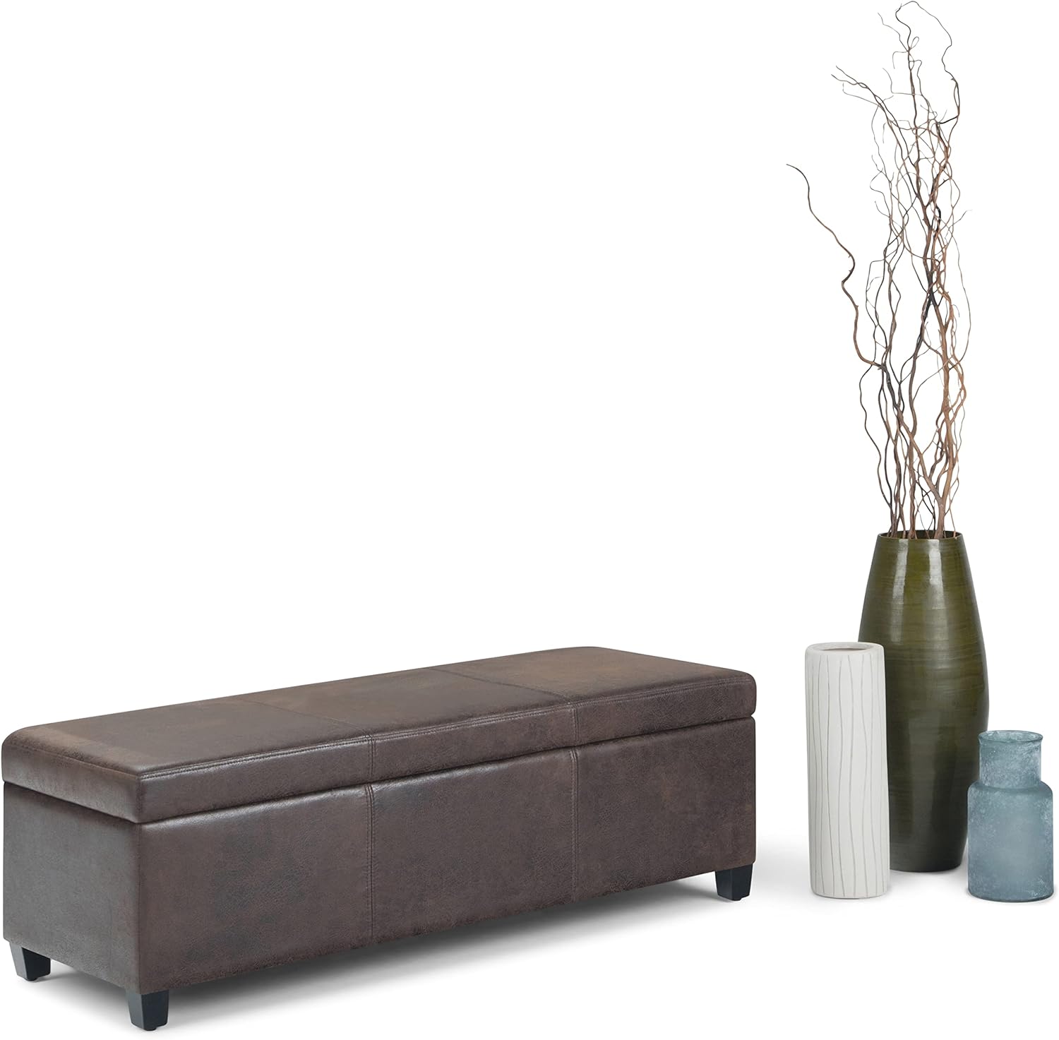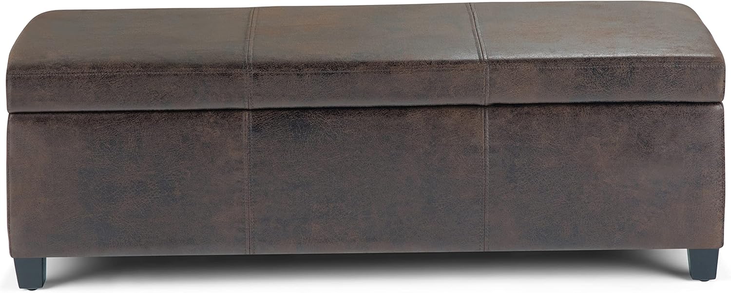 SIMPLIHOME Avalon 48 inch Wide Contemporary Rectangle Storage Ottoman Bench in Distressed Brown Vegan Faux Leather, Assembled, for the Living Room, Entryway and Family Room