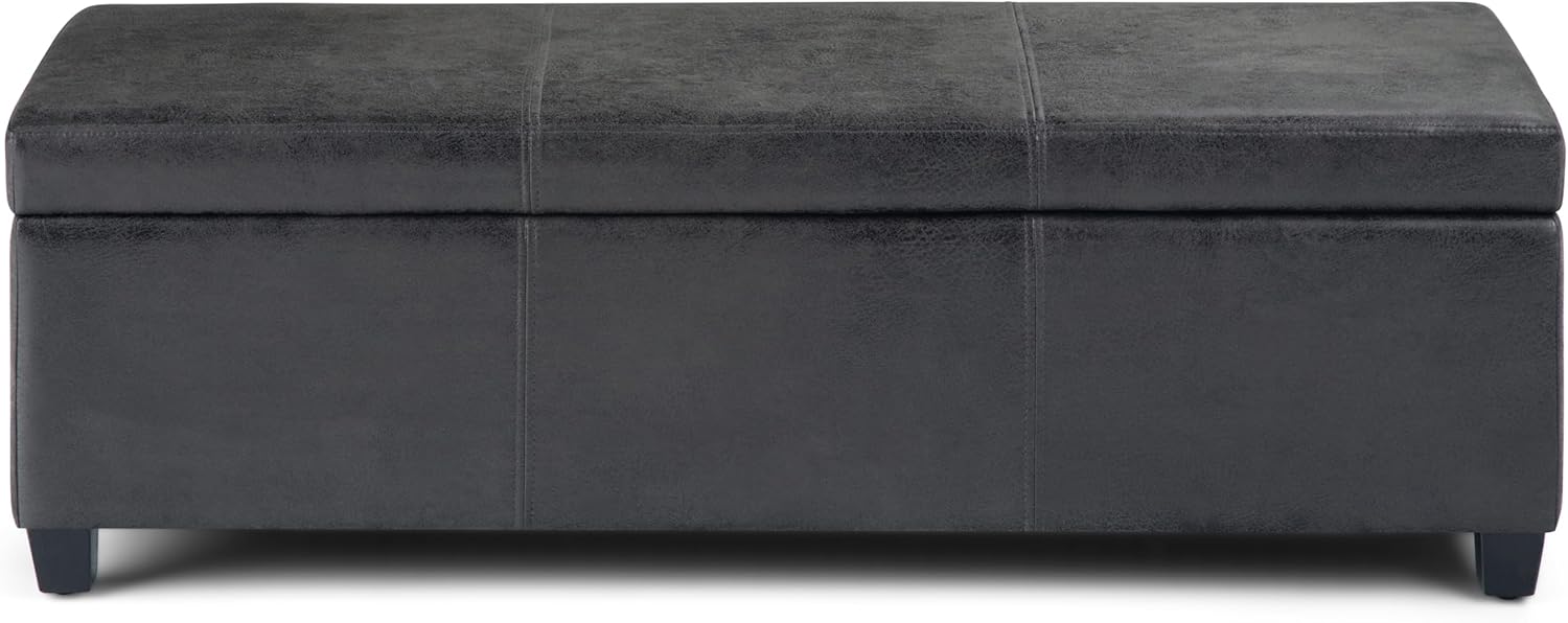 SIMPLIHOME Avalon 48 inch Wide Contemporary Rectangle Storage Ottoman Bench in Distressed Black Distressed Vegan Faux Leather, Assembled, For the Living Room, Entryway and Family Room