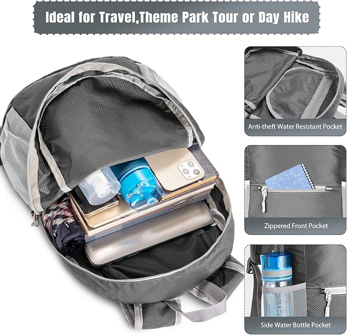 - 20l Ultra Lightweight Foldable Backpack: Our packable hiking backpack water resistant capacity is 20L,the pocket distribution is reasonable,and items are stored in an orderly manner.The main bag is stored clothings,and tourist guidelines in inner partitions.One front bag stores small equipment such as mobile phones,mobile power supply,and two side bags store umbrellas,water bottles or sunglasses.Our small foldable backpack meets the needs of carrying lightweight items