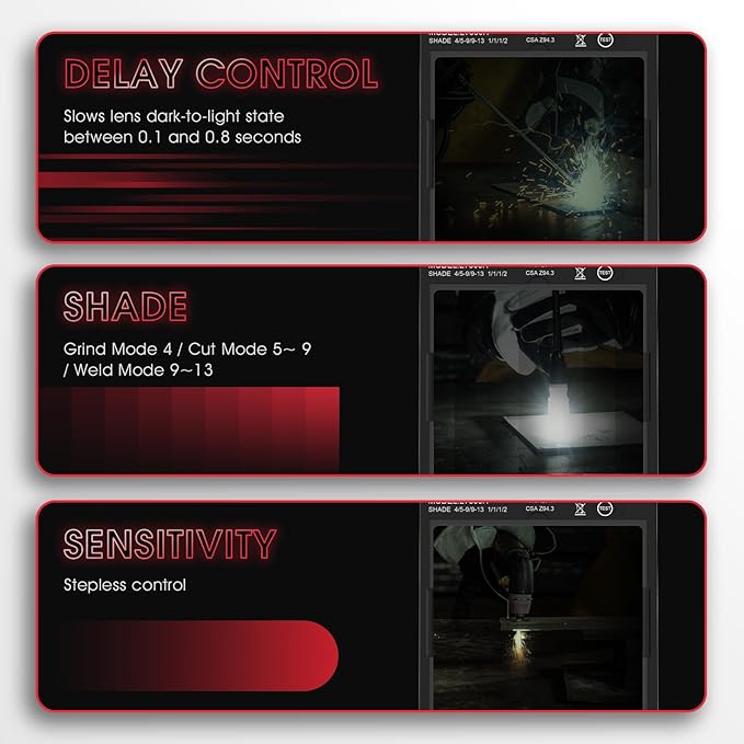 - Fast Auto-darkening: Features 4 Arc Sensors for reliable arc detection, ultra-fast switching (1/30000 sec), and adjustable Sensitivity and Delay Controls for perfect performance