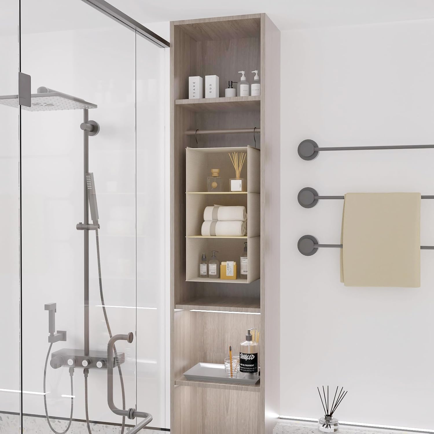 Hanging Closet Organizer, Easy Mount Foldable 3-Shelf Hanging Closet Wardrobe Storage Shelves, Clothes Handbag Shoes Accessories Storage, Imitation Linen Fabric, Beige Houndstooth