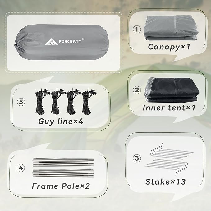 - 【LIGHTWEIGHT AND CONVENIENT】 The internal size of the Forceatt camping tent is 86.6x51.1x43.3in (220x130x110cm), which can accommodate two person at the same time. At the same time, it has a package size of 41 x 14cm and weighs 5.68lb (2.58kg), which saves space and is easy to carry.