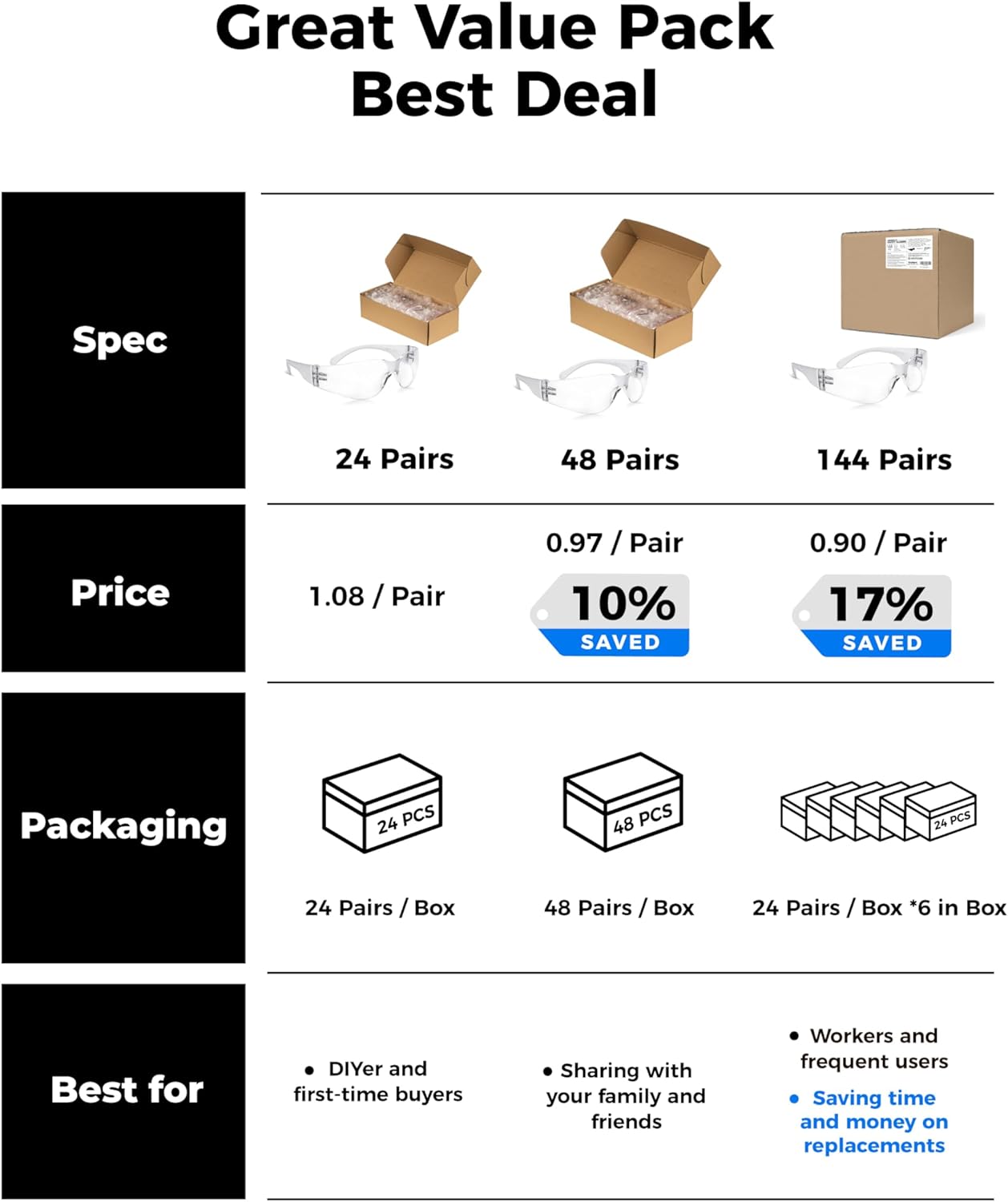 - MULTIPACK FOR DAILY USE. Bulk pack of 48 pairs of Individually-Wrapped Protective Safety Glasses. Reasonable price for your everyday protection. Let Amoolo guard your eyes against particles, splashes and debris to the naked eye.