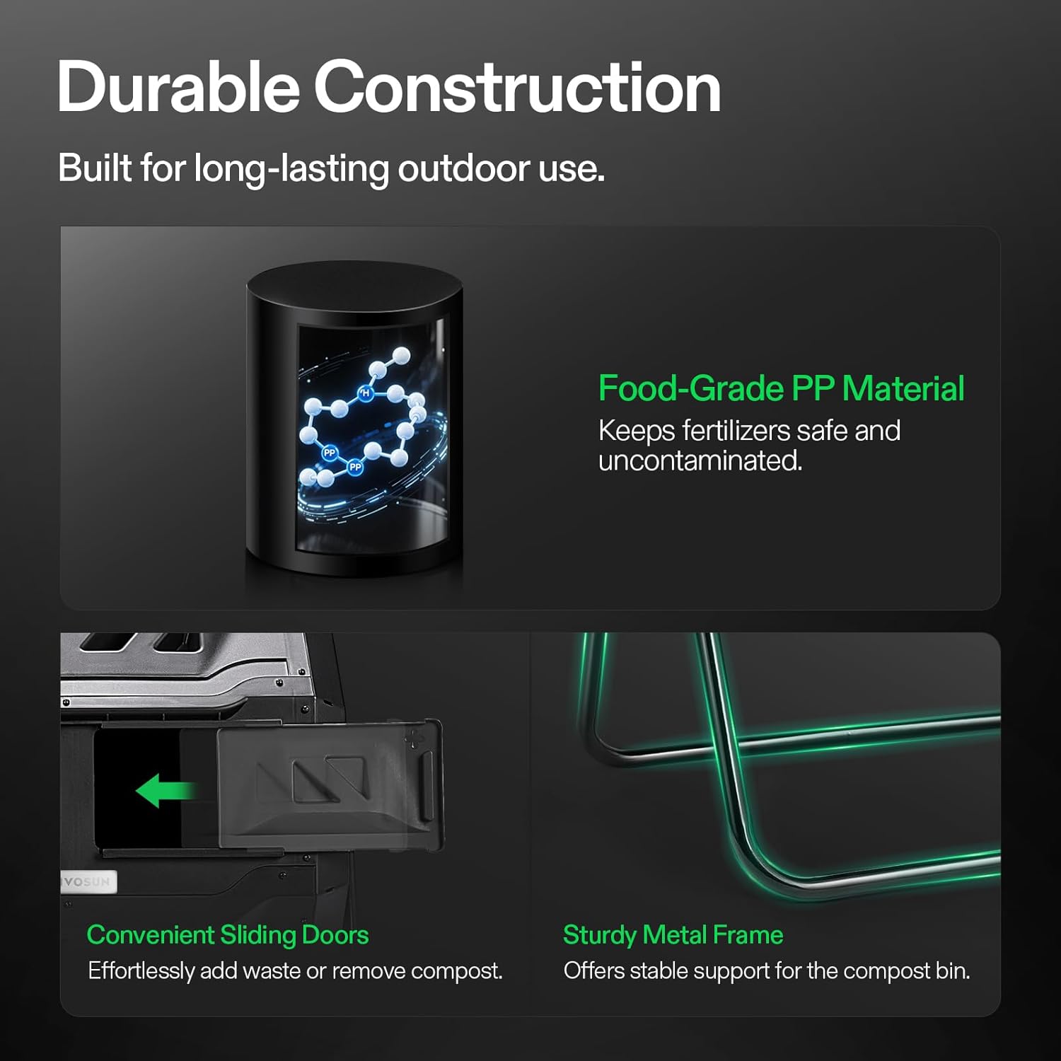- Twin chambers: Two separate chambers allow one side to finish composting while leaving the other side available to add fresh wastes; Constant alternation of the two sides will create an uninterrupted stream of nutritious compost