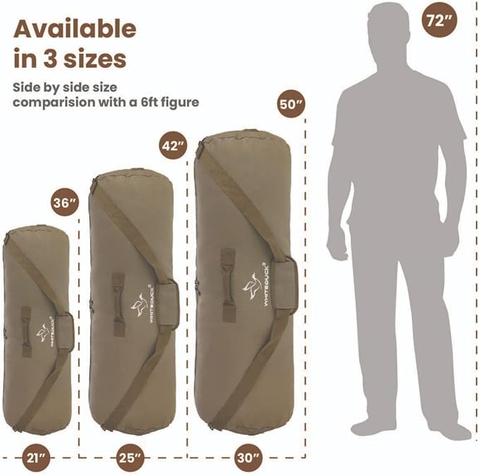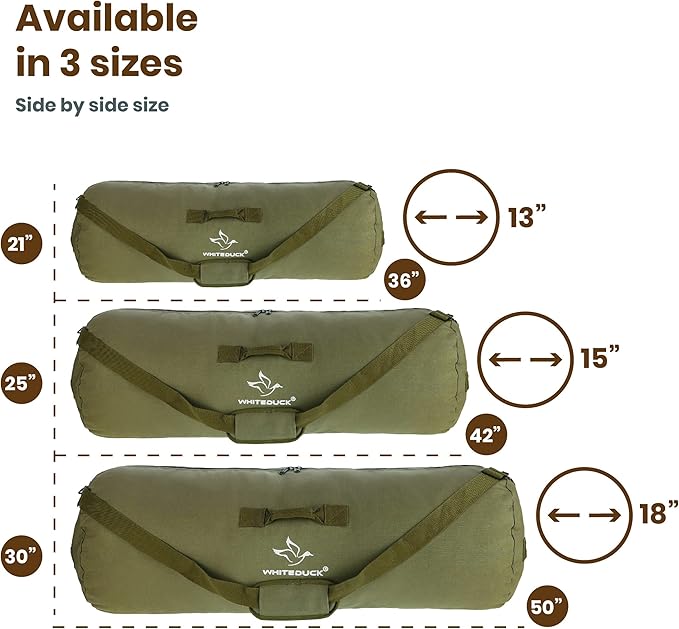 - SPACIOUS MAIN COMPARTMENT: Durable and functional duffle bag comes in 3 different sizes; Standard Size: 36" (Height) x 13" (Diameter) | 21" Flat Width, Large Size: 42" (Height) x 15" (Diameter) | 25" Flat Width, Extra Large Size: 50" (Height) x 18.5" (Diameter) | 30" Flat Width, depending upon your need. Itโs large enough to store all your gear and gym accessories for long trips and traveling. This tight woven canvas won't rip or tear apart. Perfect for packing, moving and storing items.