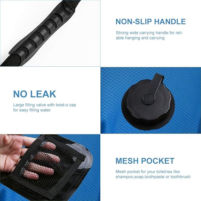 - 【High Water Capacity】This camping shower bag can carry up to 5 gallons/20L water for showering outdoor, let you enjoy a better and refreshing shower anywhere. In addition, our portable shower bag is so compact and lightweight that you can carry it in luggage, backpack or car trunk conveniently.