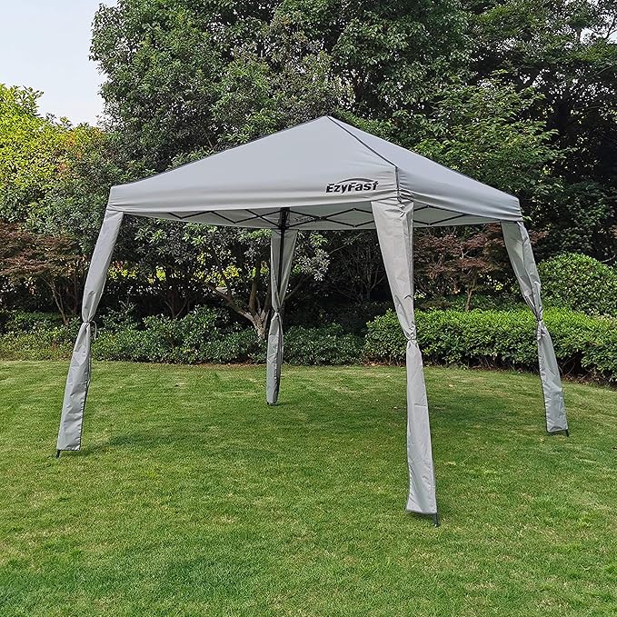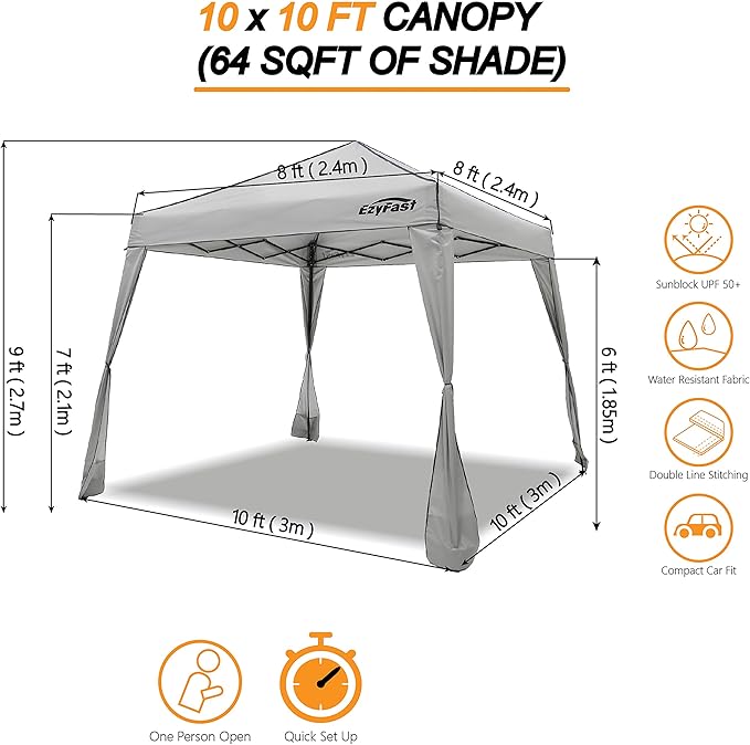 - CANOPY SIZE: 10x10 ft at the base with 8x8 ft canopy fabric top. Provides 64 sq ft of shade coverage.