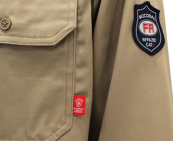 - FR MATRIALS LIGHT WEIGHT:Light Water/Rain Repellent and Oil/Stain Resistant 6.25oz Cotton Twill FR Treated,FR Buttons,FR Sewing Threads!Clear FR Tag on arms and bottom front.More FR info On Neck Tag about UL Certification.We Attached A Small Sample Inside Package For Customers Simple FR Try