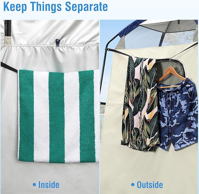 - 【Best Privacy Room】 A large zippered entry door provides easy access and 2 double-layered (cloth + mesh) windows , which can be closed or opened. Also, the mesh tent top with removable waterproof top rain fly. Both privacy and ventilation are very good. There are also 2 storage bags inside for storing toiletries. 1 inside strap for hanging your changing clothes and 1 outside strap to keep clothes and towel dry