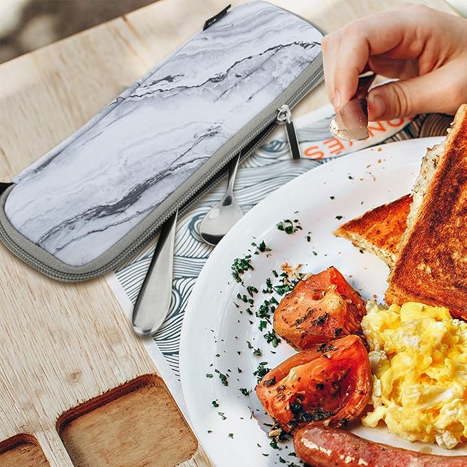 CM Reusable Portable Travel Tableware Carrying Bag Storage Case Cutlery Flatware Organziers for Straw Spoon Fork Chopsticks Utensil Holder (Marble White Pattern)