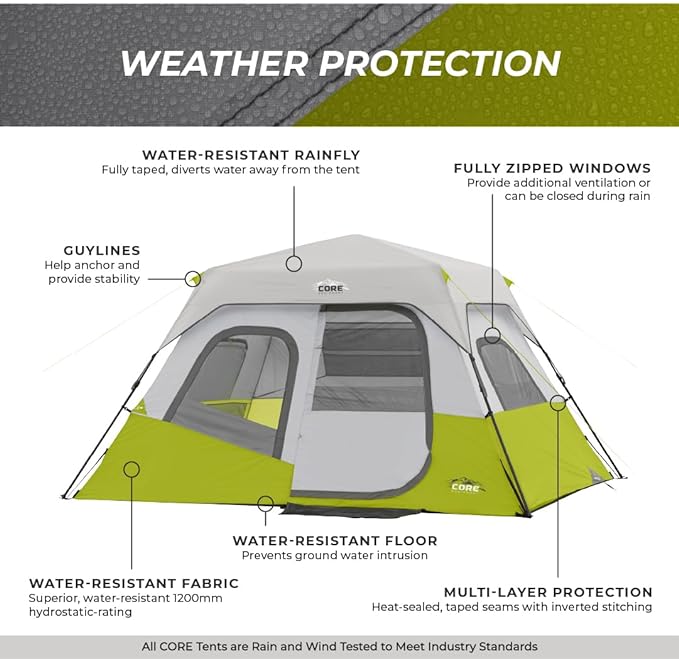 CORE Instant Cabin Tents | 6 Person / 9 Person / 10 Person / 12 Person Family Cabin Multi Room Pop Up Tents Car Camping | Included Storage Pockets for Camping Accessories