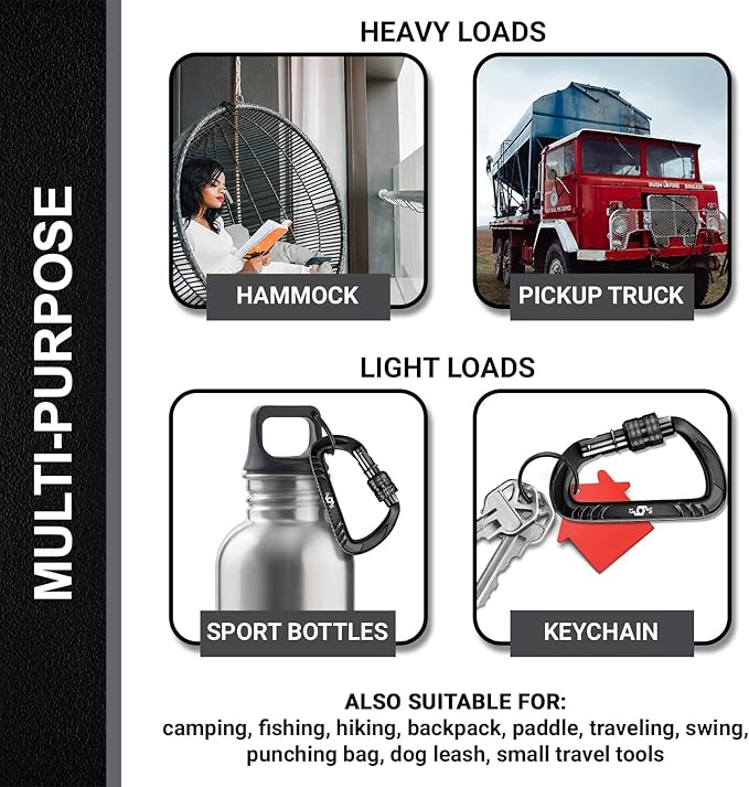 - 【Multi Purpose】 Rhino locking Carabineers are suitable for: hammock, camping, fishing, hiking, backpack, paddle, traveling, swing, punching bag, dog leash, attach sports bottles, yeti sling, keychain, travel tools, fix heavy object on a pickup truck, backpack clips for kids, keychain for women, bag hook, snap hooks, key clip for men, accessory & keychain carabiners, gear ties, toy grappling hook, cable machine accessories, key holder, d ring, boxing bag. Not For Climbing.