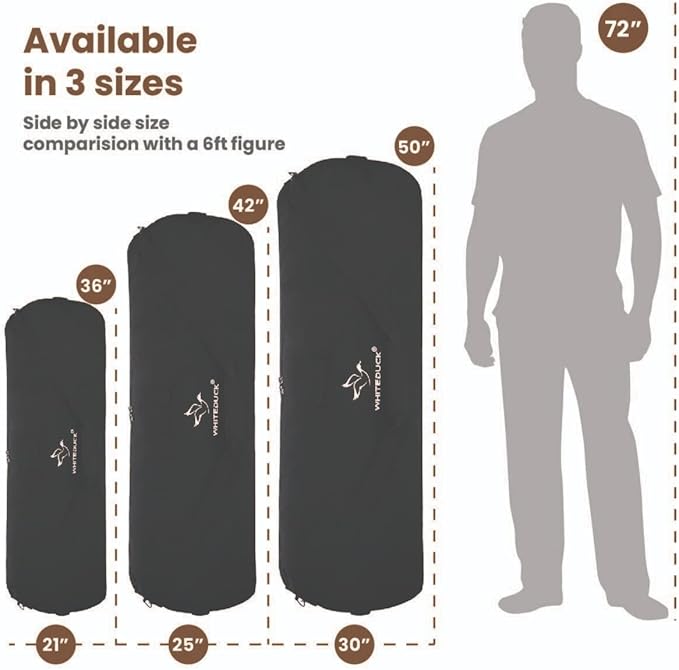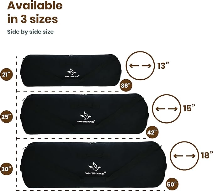 • SPACIOUS MAIN COMPARTMENT: Durable and functional duffle bag comes in 3 different sizes; Standard Size: 36" (Height) x 13" (Diameter) | 21" Flat Width, Large Size: 42" (Height) x 15" (Diameter) | 25" Flat Width, Extra Large Size: 50" (Height) x 18.5" (Diameter) | 30" Flat Width, depending upon your need. Itโ€™s large enough to store all your gear and gym accessories for long trips and traveling. This tight woven canvas won't rip or tear apart. Perfect for packing, moving and storing items.
