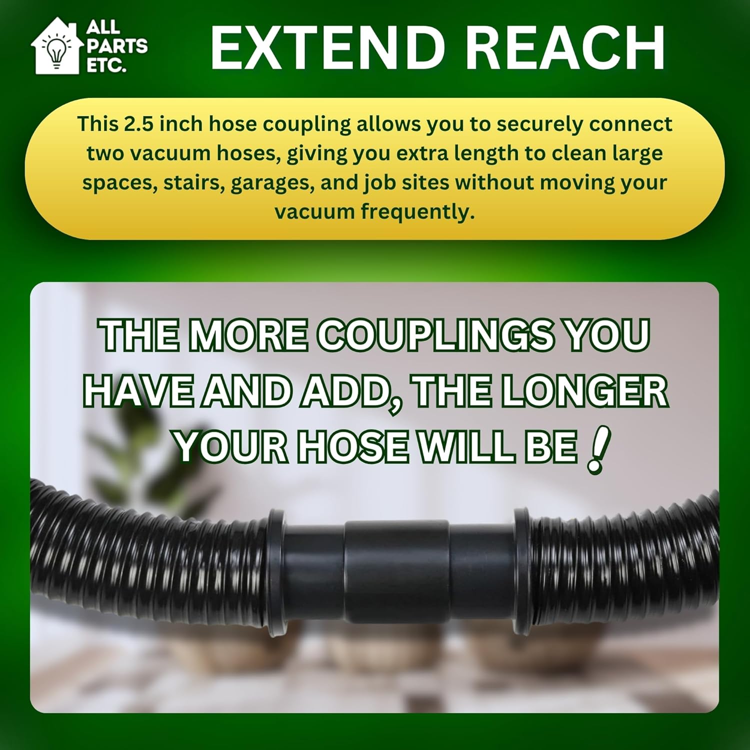 - EXTEND YOUR CLEANING REACH – This 2.5 inch hose coupling allows you to securely connect two vacuum hoses, giving you extra length to clean large spaces, stairs, garages, and job sites without moving your vacuum frequently.