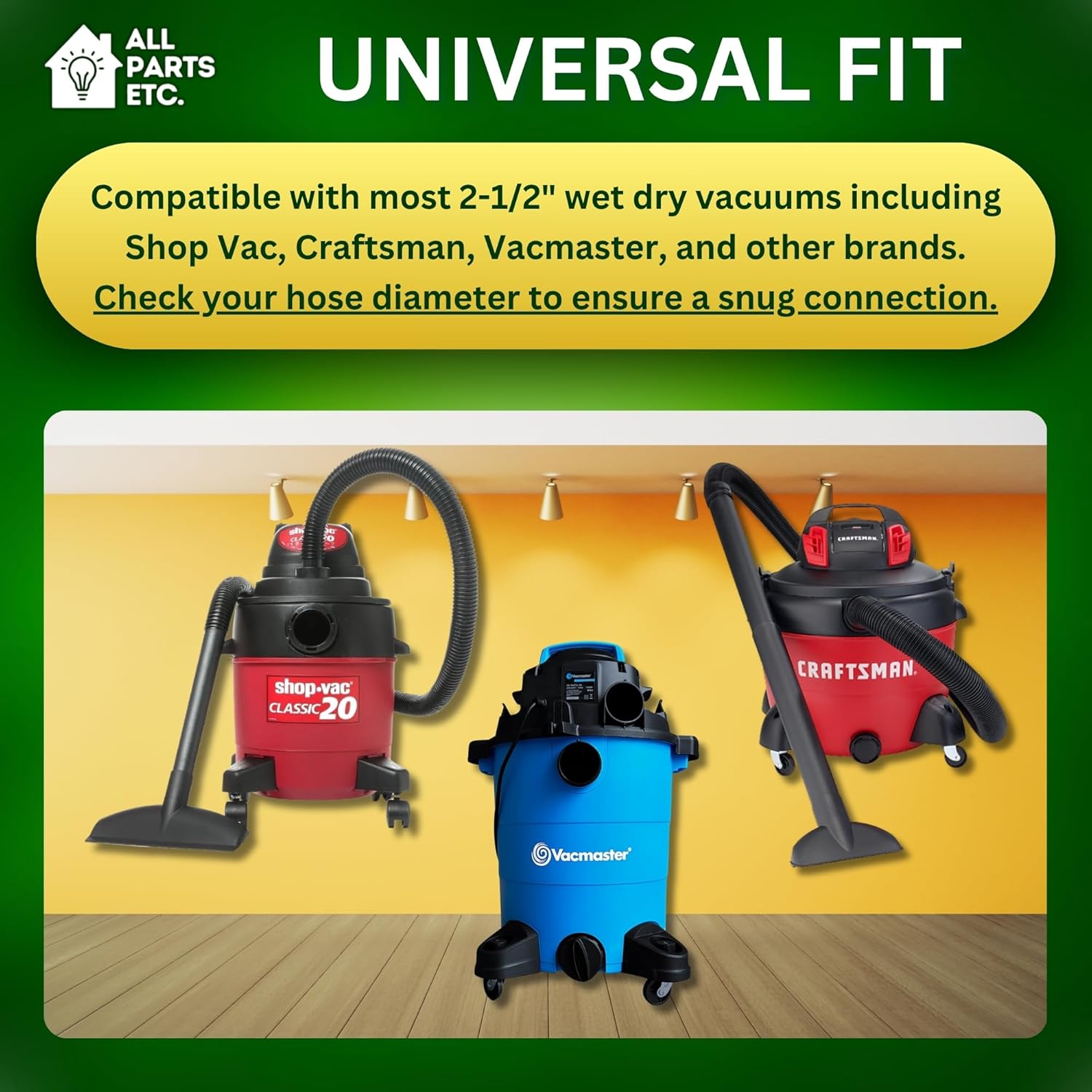 - UNIVERSAL FIT – Compatible with most 2-1/2" wet dry vacuums including Shop Vac, Craftsman, Vacmaster, and other brands. Check your hose diameter to ensure a snug connection.