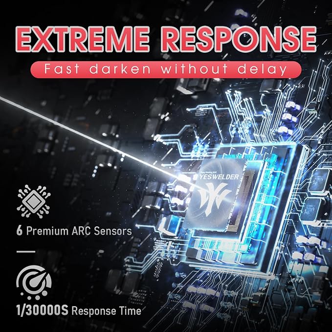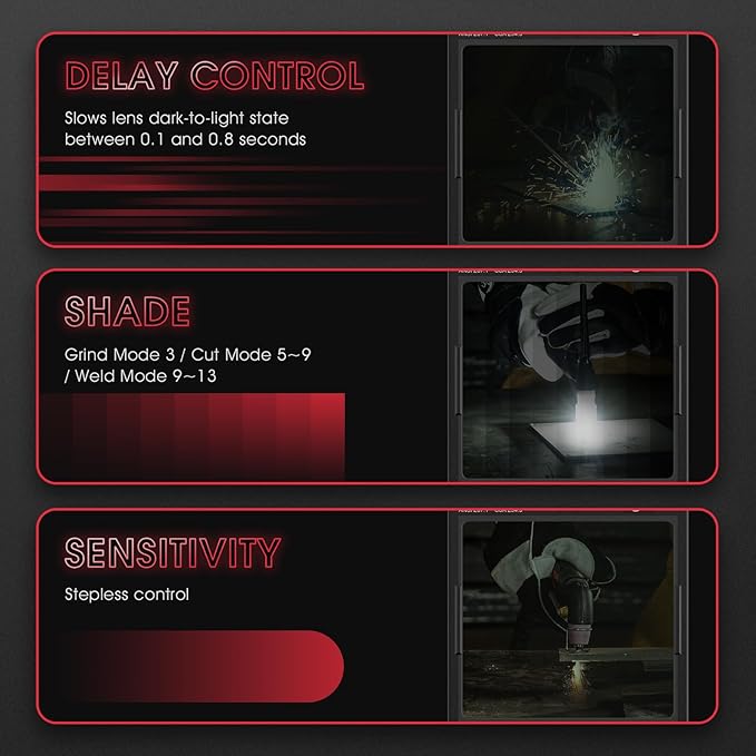 - Fast Auto-darkening: Features 4 Arc Sensors for reliable arc detection, ultra-fast switching (1/30000 sec), and adjustable Sensitivity and Delay Controls for perfect performance