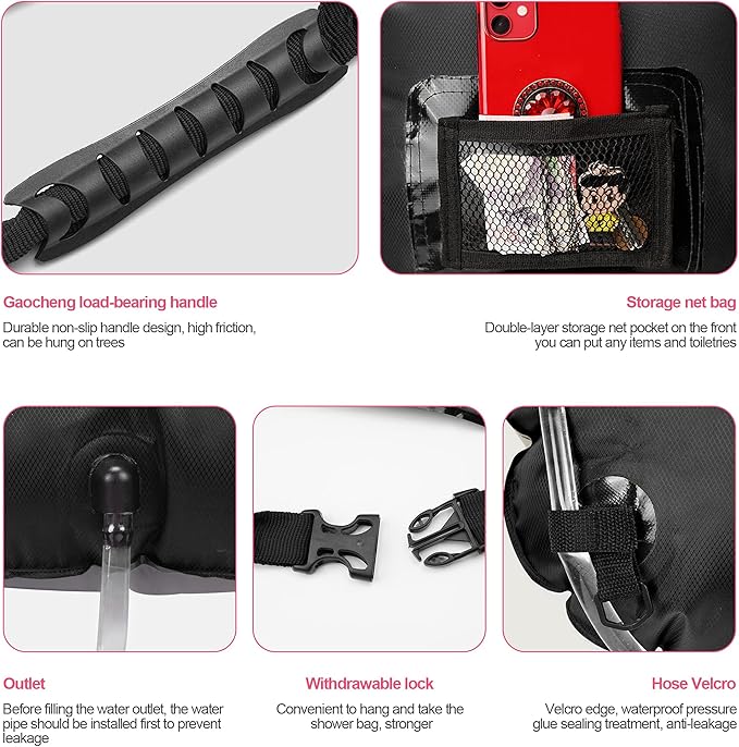 - RICH AND PRACTICAL ACCESSORIES - Our camping shower bag contains a hose, a shower head which we have upgraded and installed a convenient and practical ON/OFF knob, allowing you to easily control the water flowing; In addition, a practical mesh bag is sewn to hold some mini-travel essentials, such as small bottles of shower gel, shampoo, facial cleanser, razor, nail clippers, etc.