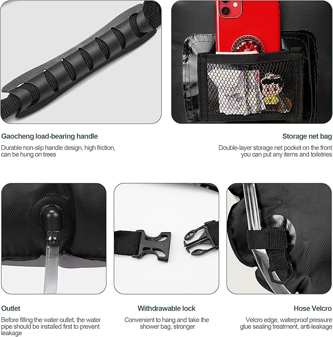 - RICH AND PRACTICAL ACCESSORIES - Our camping shower bag contains a hose, a shower head which we have upgraded and installed a convenient and practical ON/OFF knob, allowing you to easily control the water flowing; In addition, a practical mesh bag is sewn to hold some mini-travel essentials, such as small bottles of shower gel, shampoo, facial cleanser, razor, nail clippers, etc.