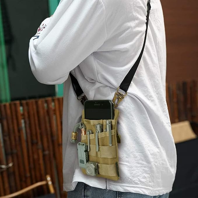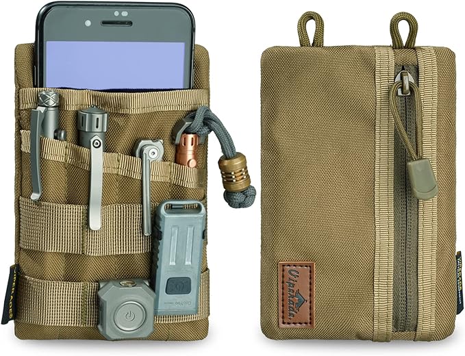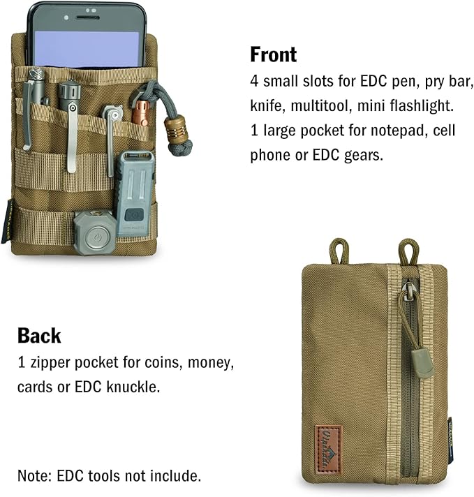 - 【High Capacity】Pocket tool organizer has four accessory pockets and a zipper pocket on the back, which can hold mini flashlights, folding knives, tactical pens, larger multi-tool and other EDC gear. The large pocket at the top usually holds a 3.5''*5.5'' notebook or your cell phone(Screen Size ≤6.5’’). MOLLE plug-in design can hold tools with pocket clips, which greatly saves space.