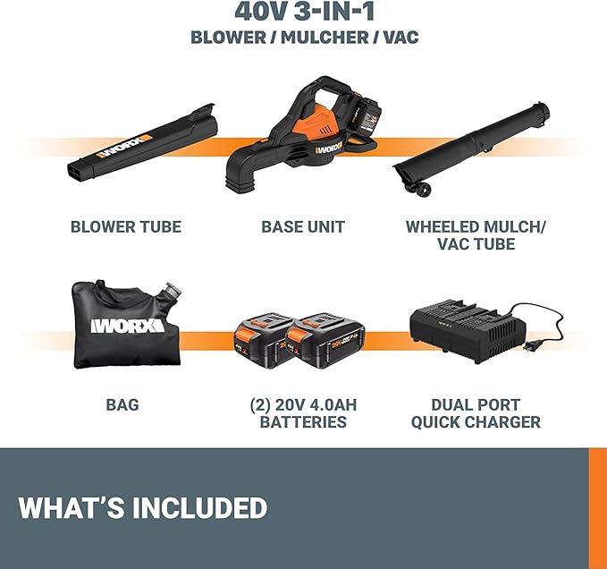 WORX WG583 40V Cordless Leaf Blower, 3 in 1 Blowers for Lawn Care with Vacuum & Mulcher, Electric Blower with Brushless Motor & 2 Speed Control, 2 Batteries & Charger Included