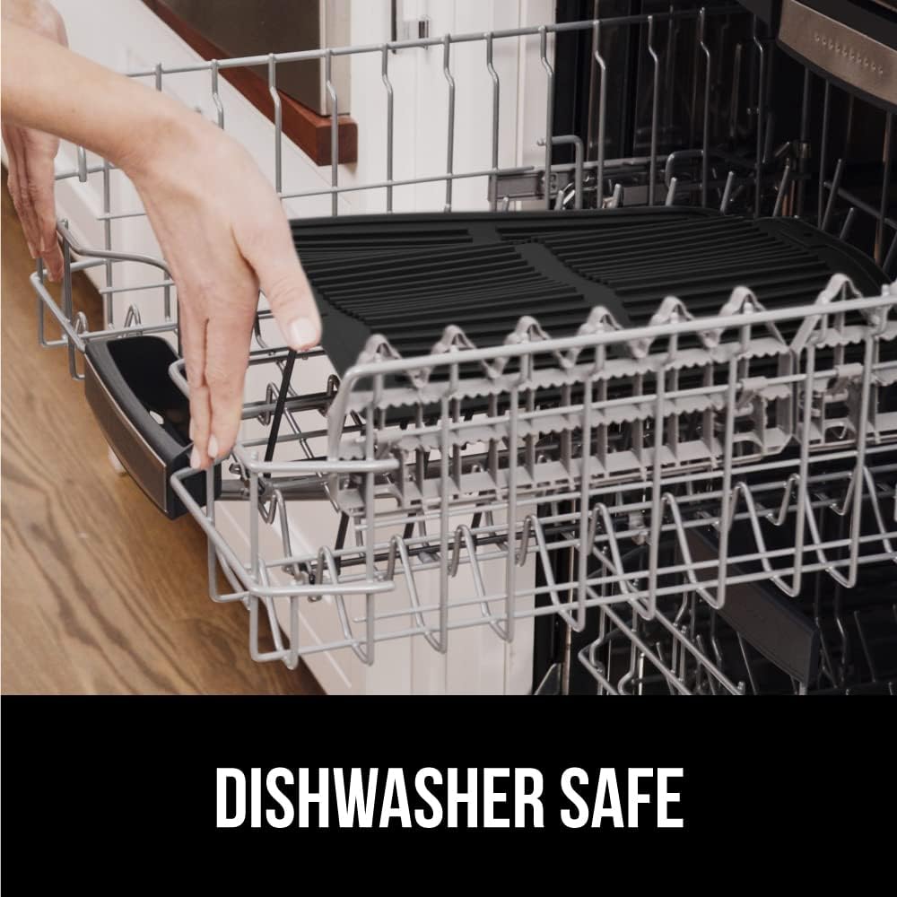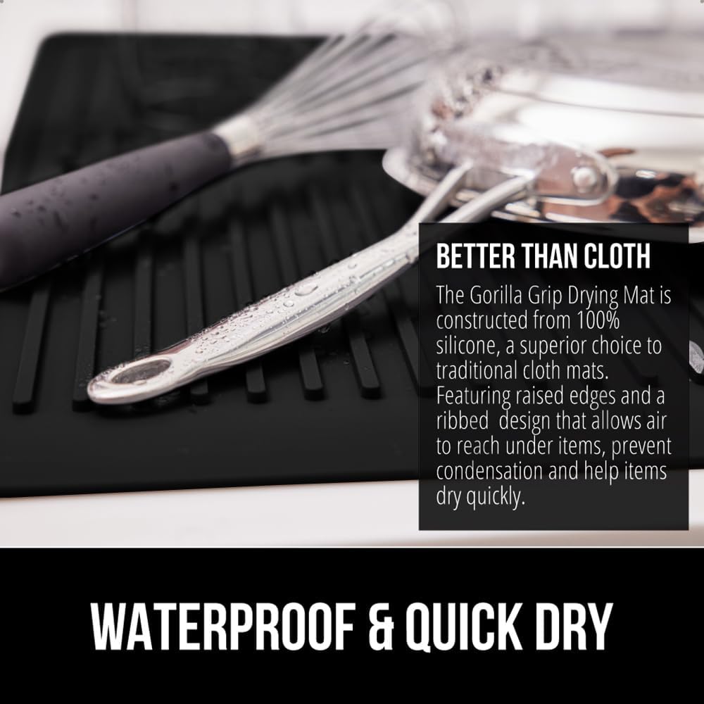 GORILLA GRIP 100% BPA-Free Patented Silicone Dish Drying Mat for Kitchen Counter, Water Catching Ribbed Design, Easy Clean Waterproof Sink Liner, Heat Resistant, Fits Under Rack, 16x12 Inch, Black