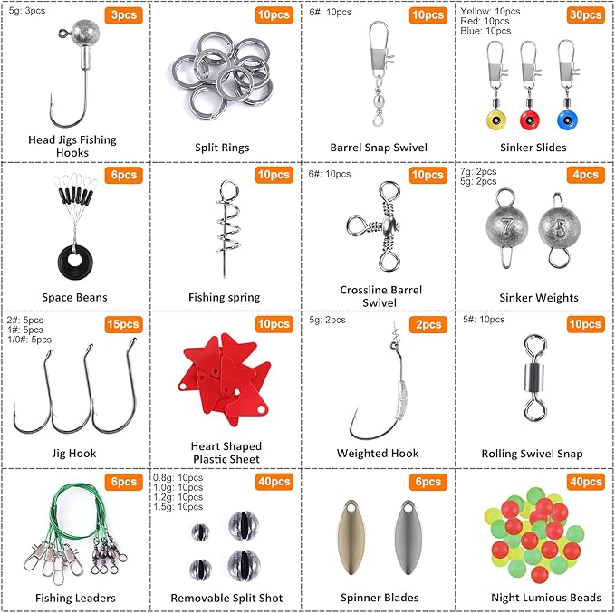 - 【Great Accessories Kit with Everything You Need】- PLUSINNO 212pcs fishing accessories kit collects with everything you need including weight hook/ head jigs hooks/fishing Worm hooks/cross-line barrel swivels/barrel snap swivels/sinker slides/fishing leaders/rolling swivel snap/heart shaped plastic sheet/sinker weights/space beans/spinner blades/split rings/fishing spring/night luminous beads/removable split shot suitable for all sorts of fishing condition. (About 0.06USD for each piece)