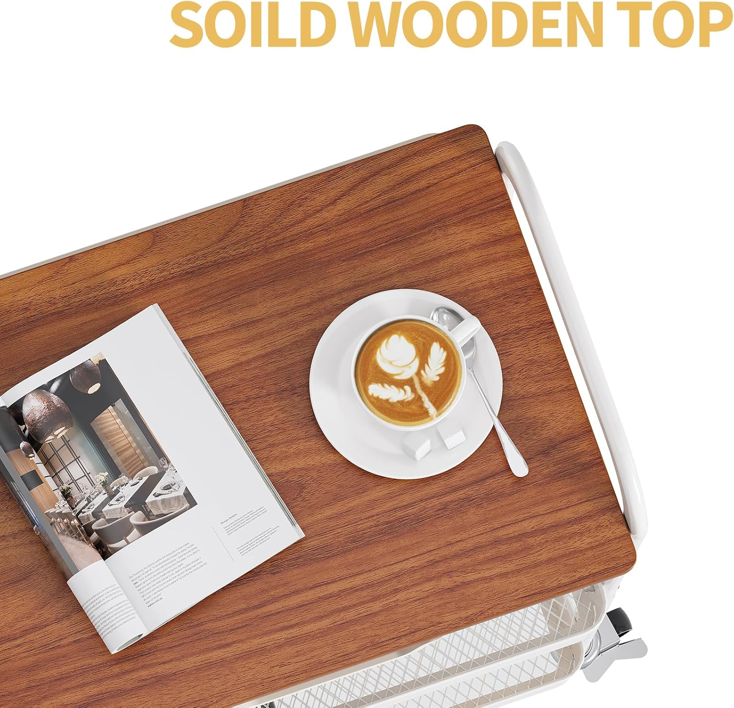 TOOLF 3-Tier Metal Utility Rolling Cart with Drawer & Wooden Table Top, Storage Cart White Trolley Kitchen Organizer Rolling Desk with Locking Wheels for Office, Classroom, Dorm, Bedroom
