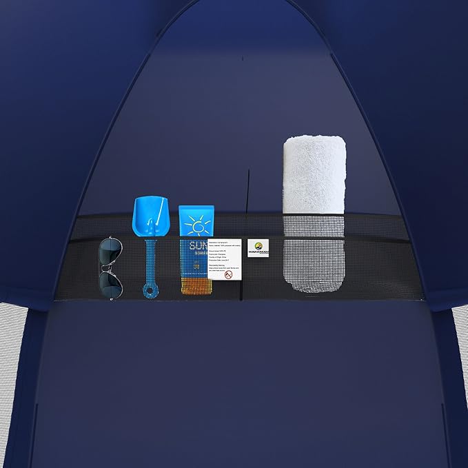 - CONVENIENT FEATURES β The fiberglass poles and sand pockets stabilize the tent against wind and the mesh windows provide ventilation and bug protection. It also includes a storage pocket for beach day accessories like suntan lotion, sunglasses and towels.