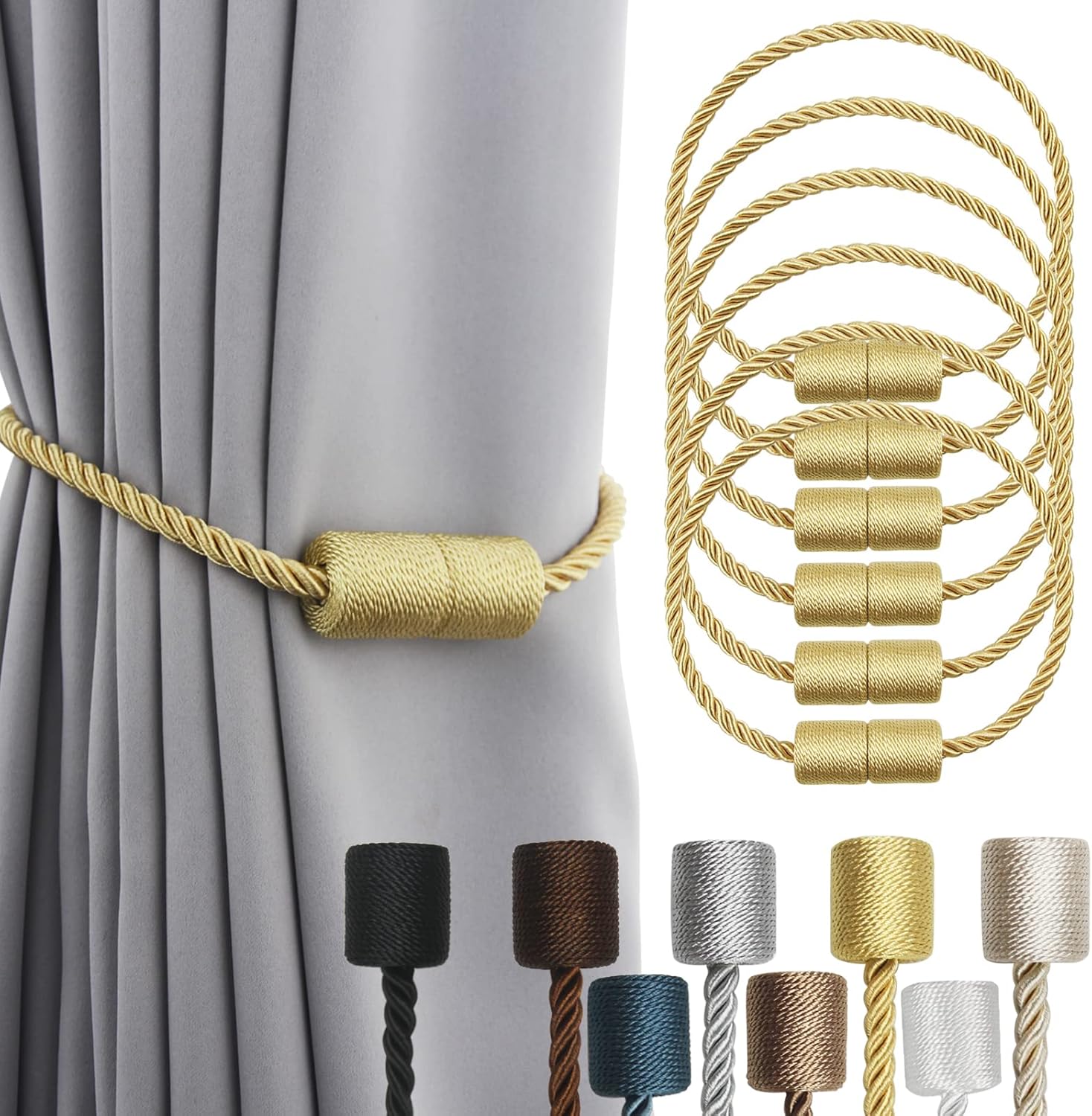 6 Pack Gold Strong Magnetic Curtain Tiebacks Outdoor Elegant Decorative Tie Backs Modern Rope Tiebacks for Drapes Window Curtain Holdbacks for Draperies