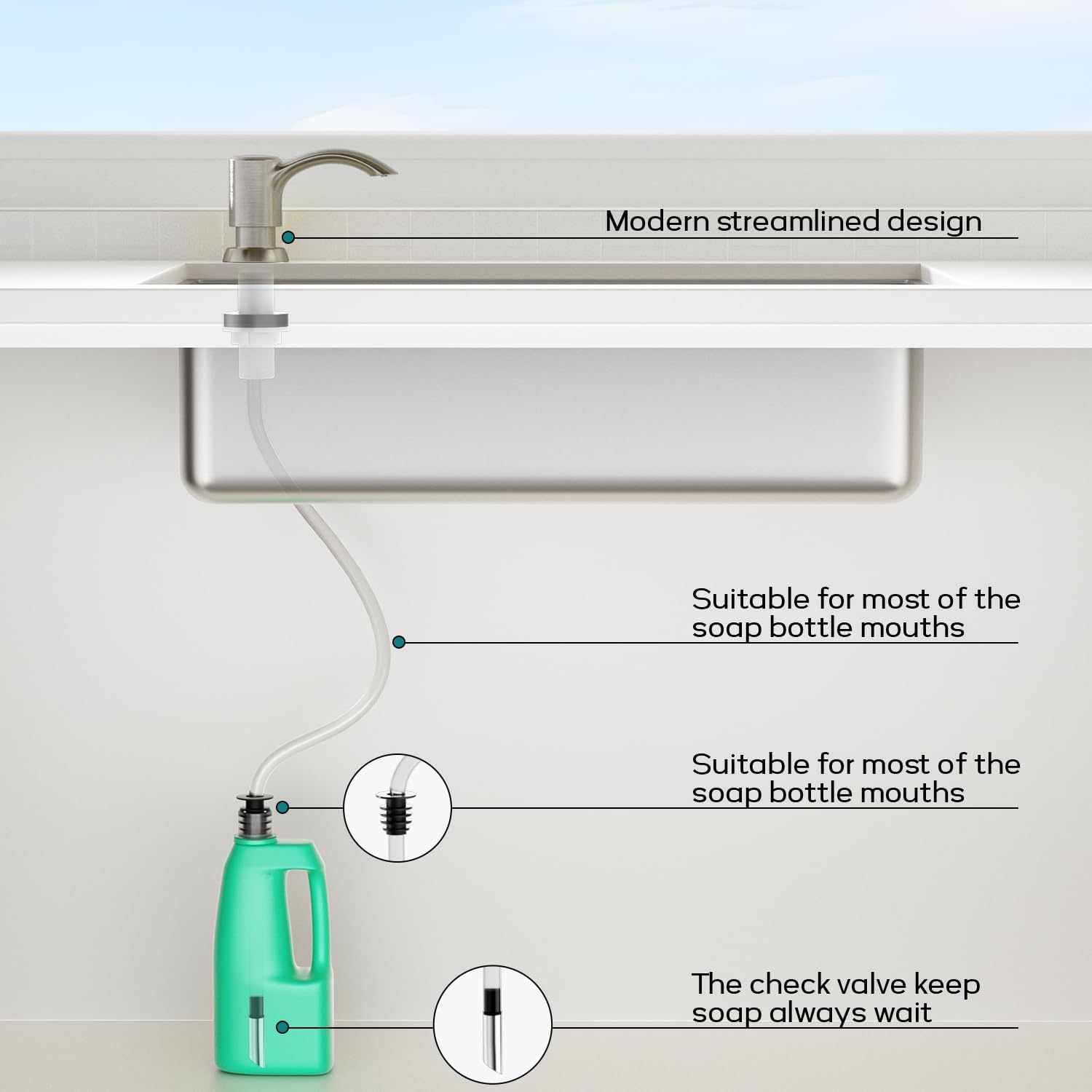 - ăInnovative Designă- The dispenser's metal check valve guarantees the tube stays submerged at the container's bottom, providing consistent suction for liquid soap, lotion, or detergent, ensuring soap dispenses with every push.