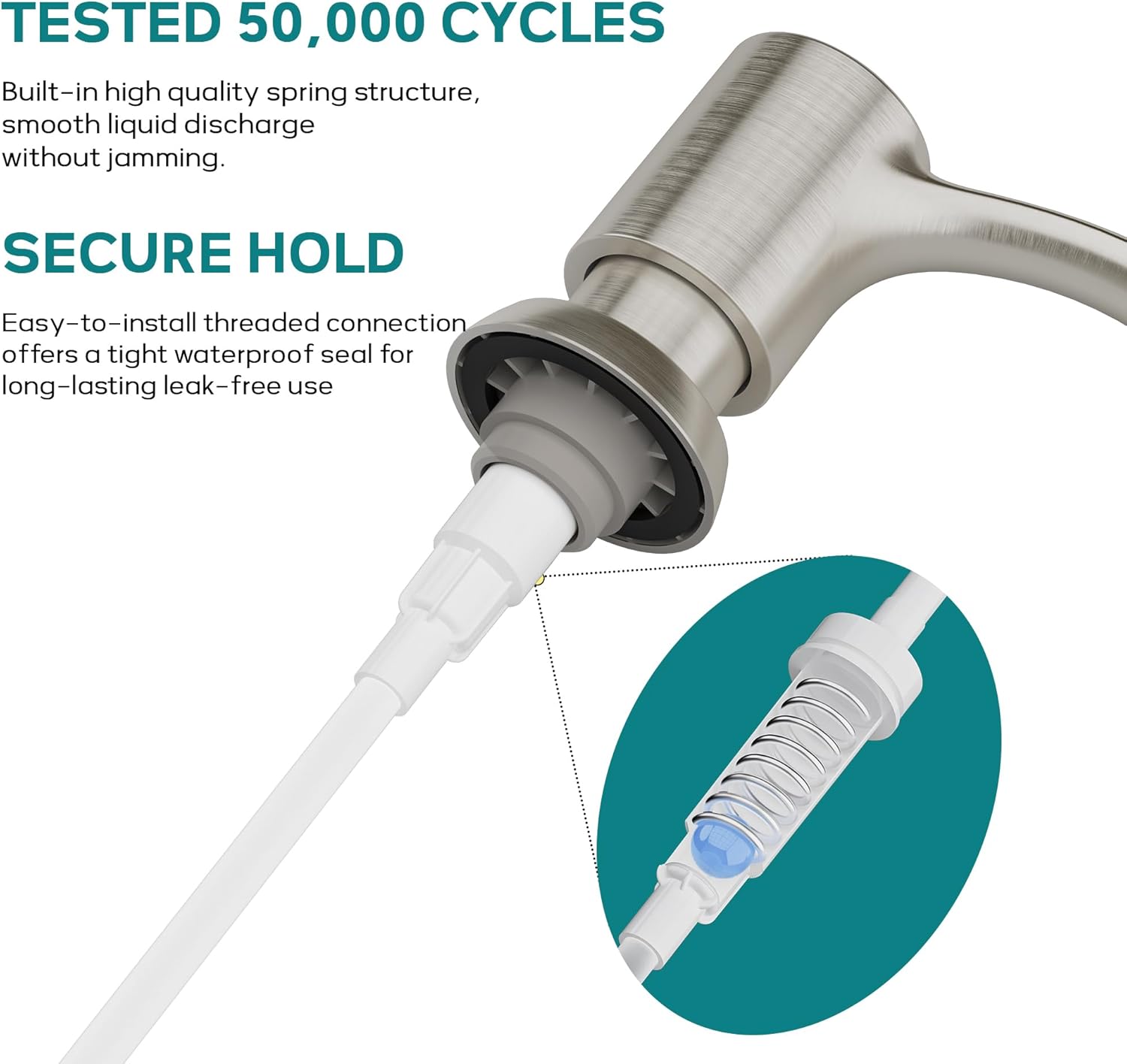 - ăDurable Constructionă- The dispenser is built with a sturdy ABS pump head, a metal check valve, and a food-grade silicone hose and stopper, all designed to resist acids and corrosion. The brushed nickel finish is fingerprint and water spot resistant, simplifying cleaning and upkeep.