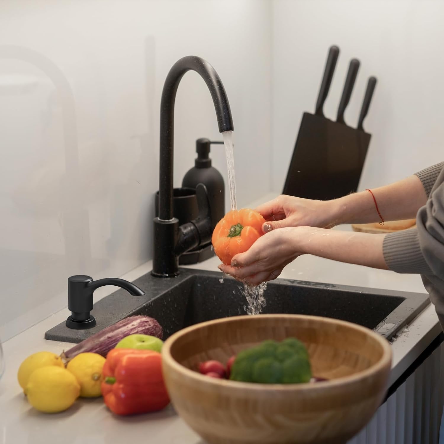 - 【Visual Coordination】- The dispenser's design seamlessly matches most black kitchen faucets, enhancing the sink's aesthetic and contributing to a neater, cleaner, and more efficient kitchen.