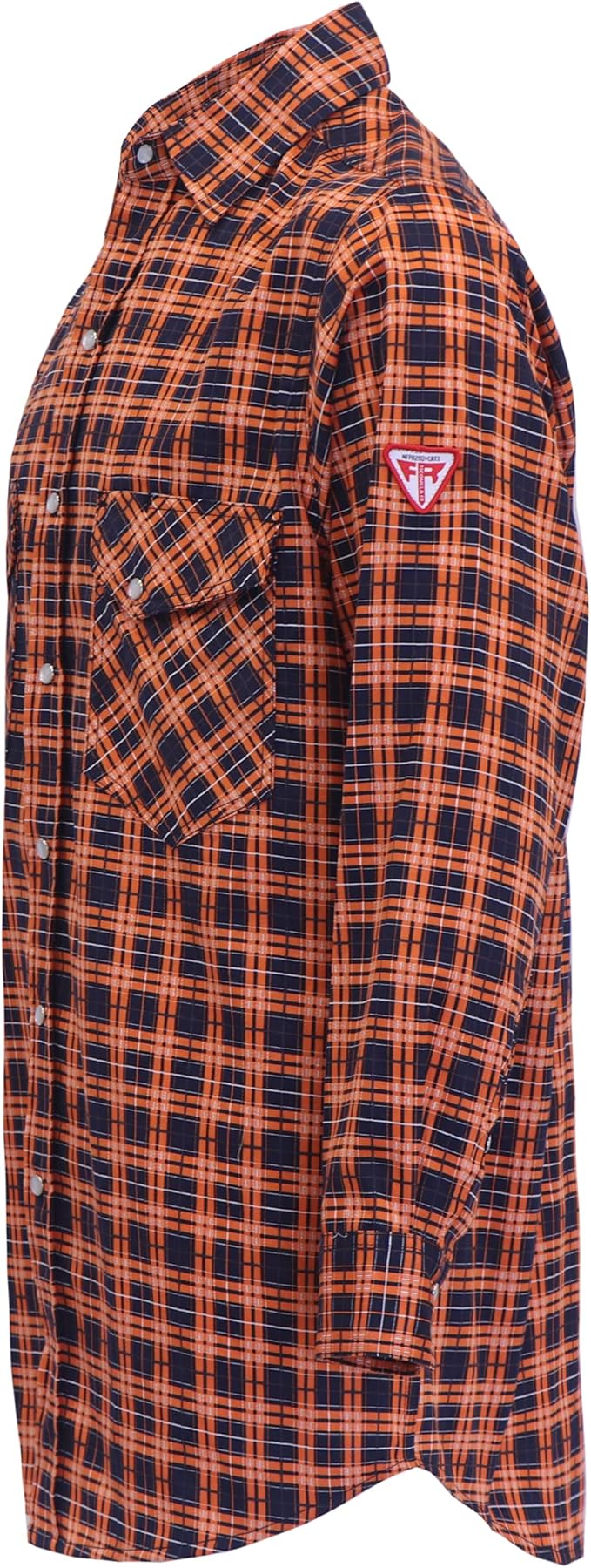 • 6.5OZ Printed Plaid Cotton Twill FR Treated,FR Buttons,FR Sewing Threads!Clear FR Tag on arms and bottom front.More FR info On Tag About UL Certification.