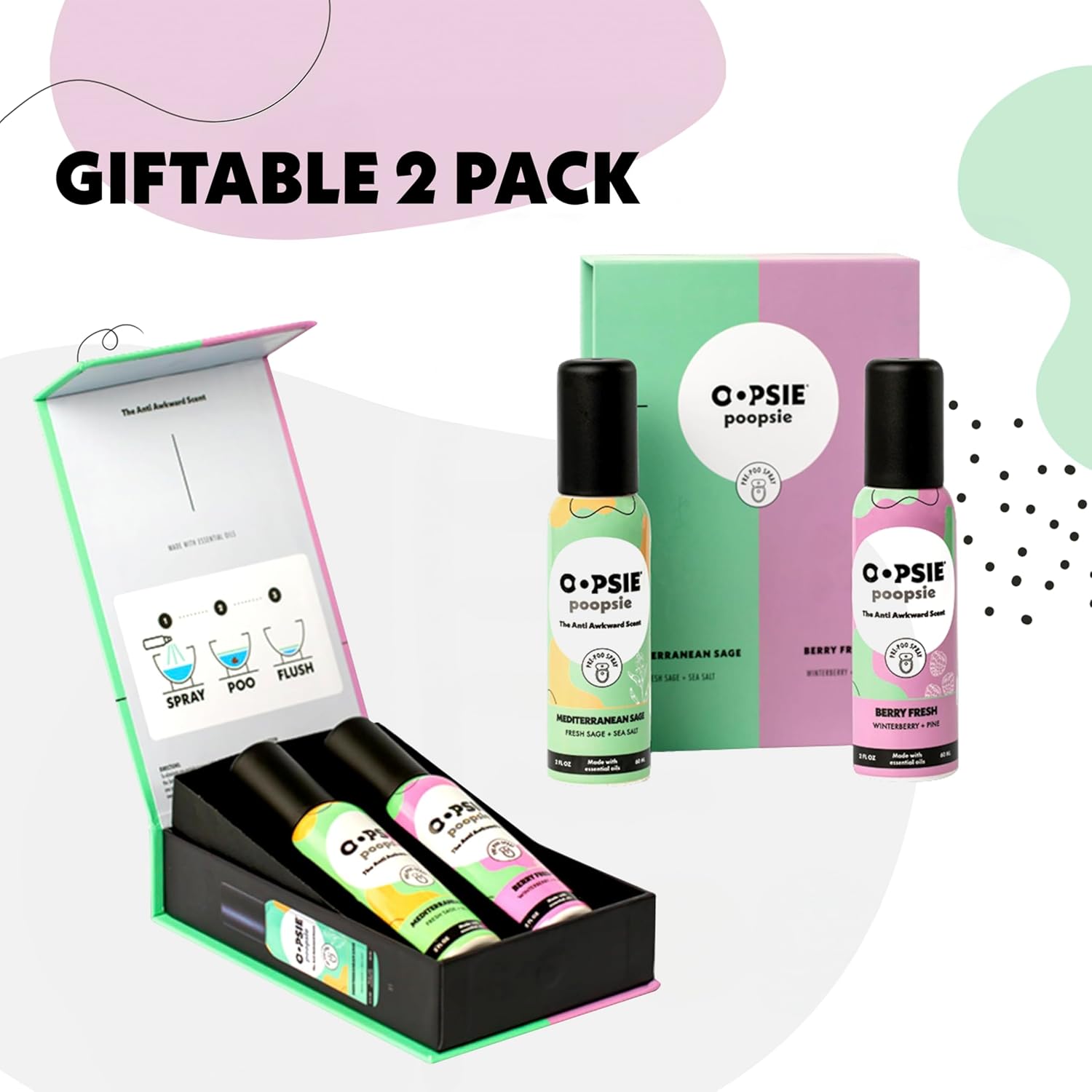 Oopsie Poopsie - Mediterranean Sage and Berry Fresh- Before & After You Go Toilet Spray 2oz Each - Gift Set - Portable Odor Eliminator - 2 Pack