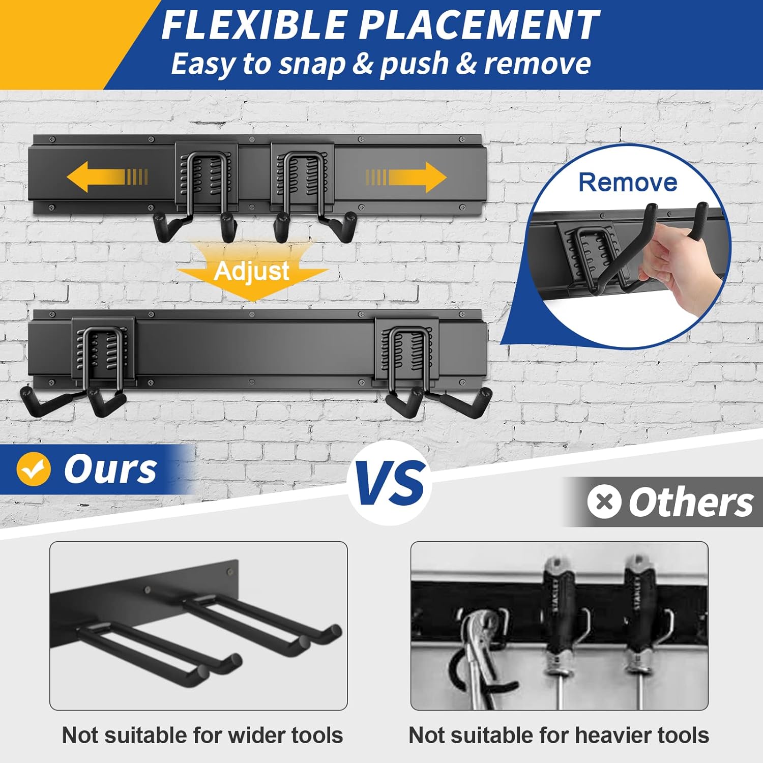 - 32-inch Adjustable Garage Wall Tool Rack: The whole length of the garage organizer wall mount is 32 Inches. Equipped with 4 hooks(2 tool hooks, 2 double-layer hooks) and 2 rails, this adjustable garden tool holder wall mount organizes all your garage/lawn/garden/tool storage room to save floor space.