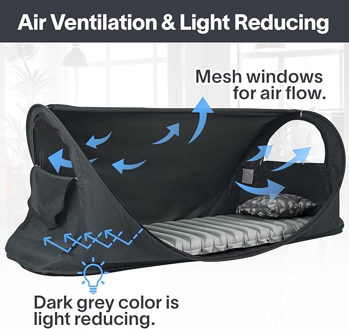 - โ๐๐ข-๐ฅ๐ข๐ ๐ก๐ญ๐ฌ: innovated design pop up automatically, no assembly needed. Only one flexible ribs frame makes it lightest bed tent on the market, only 3 lbs. Measurement, 79"L x 28"W x 28"H, is customized for one person laying down (not sitting). Create a cozy relaxing & sleeping privacy area in office or dormitory. Need no heavy mattress or attached to bed frame. A second to fall asleep! Full energy recovery!